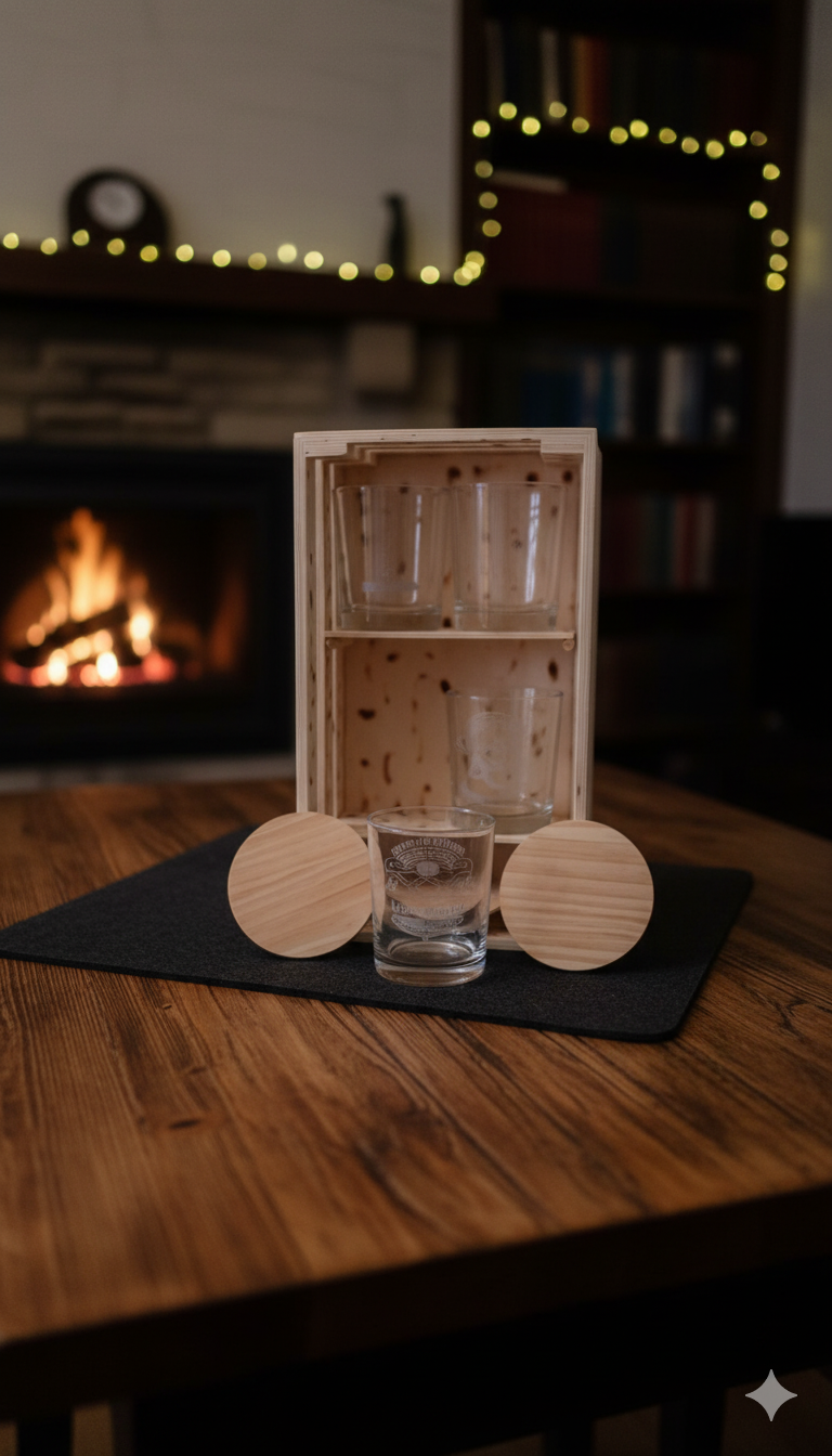 Alles aus einer Hand: Stelle dir dein individuelles Geschenkset inklusive passender Holzbox und Untersetzern zusammen.