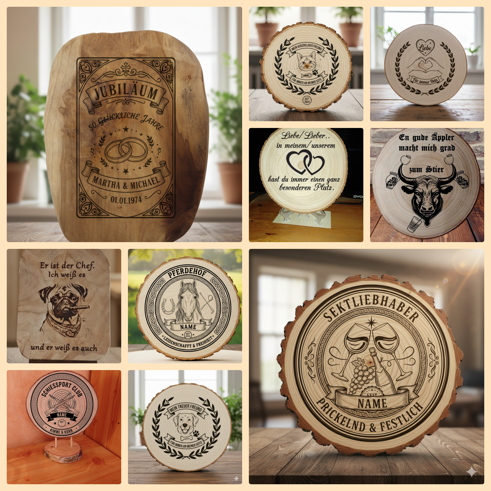 Wir fertigen individuelle Deko mit Gravur und Geschenke nach Ihren Wünschen auf:
